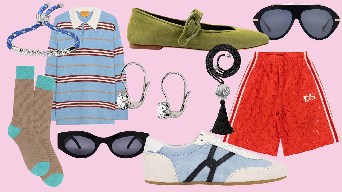 Dorsey Paracord Bracelet//Guest in Residence Cashmere Socks//GIR Striped Rugby//Le Specs Sunnies//Dorsey Earrings//Shop Julietta Shell Necklace//Larroude Flats//Dolly Sports Lace Shorts//Past Midnight Sunnies//Veronica Beard Sneakers